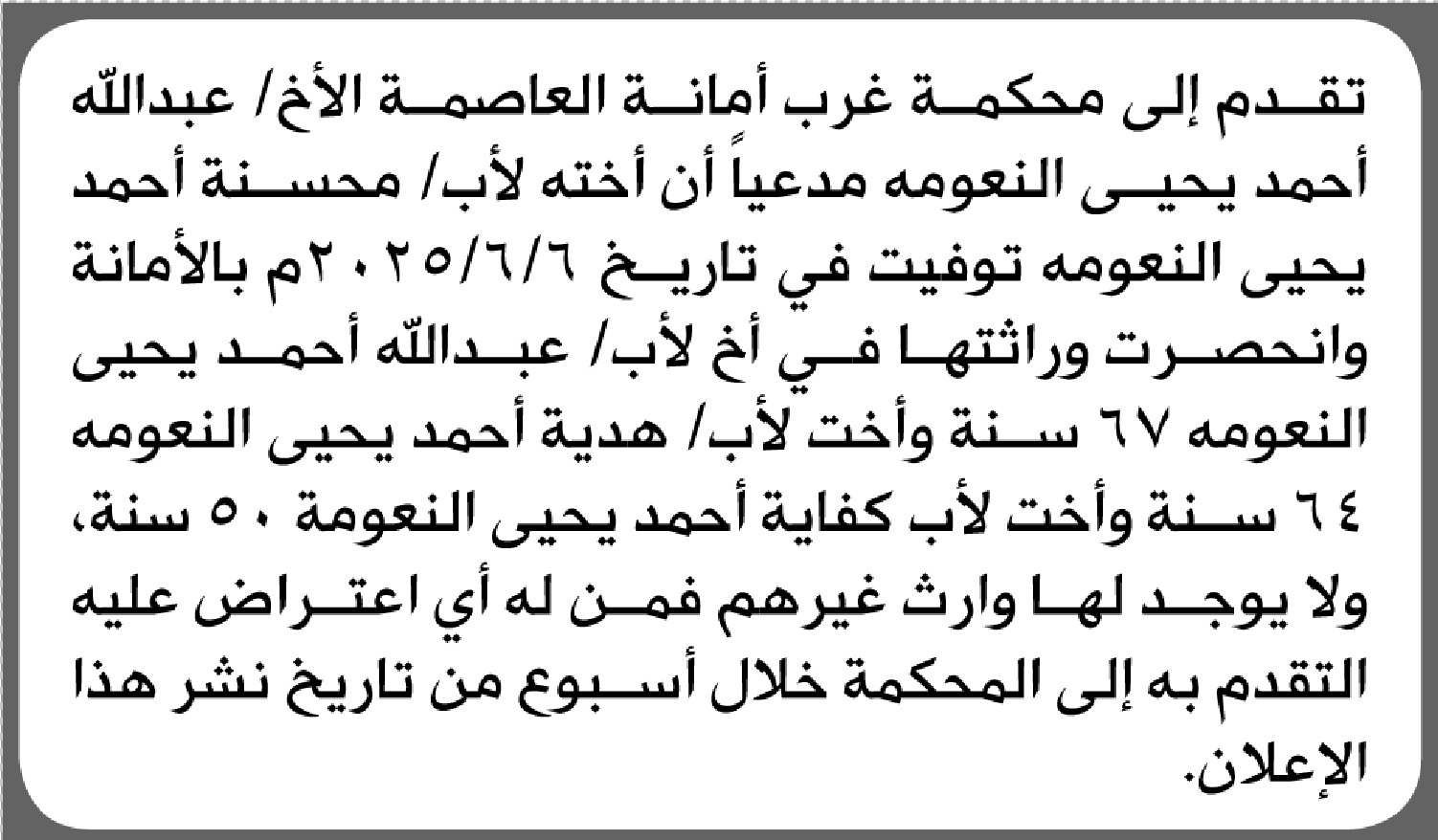 تعلن محكمة الصومعة أن الأخ عبدالله شيخ تقدم بدعوى انحصار وراثة اخته إعلاناتمحاكم On أبريل 16, 2026 Share Share FacebookTwitterWhatsAppTelegramGoogle+البريد الإلكترونيPrint