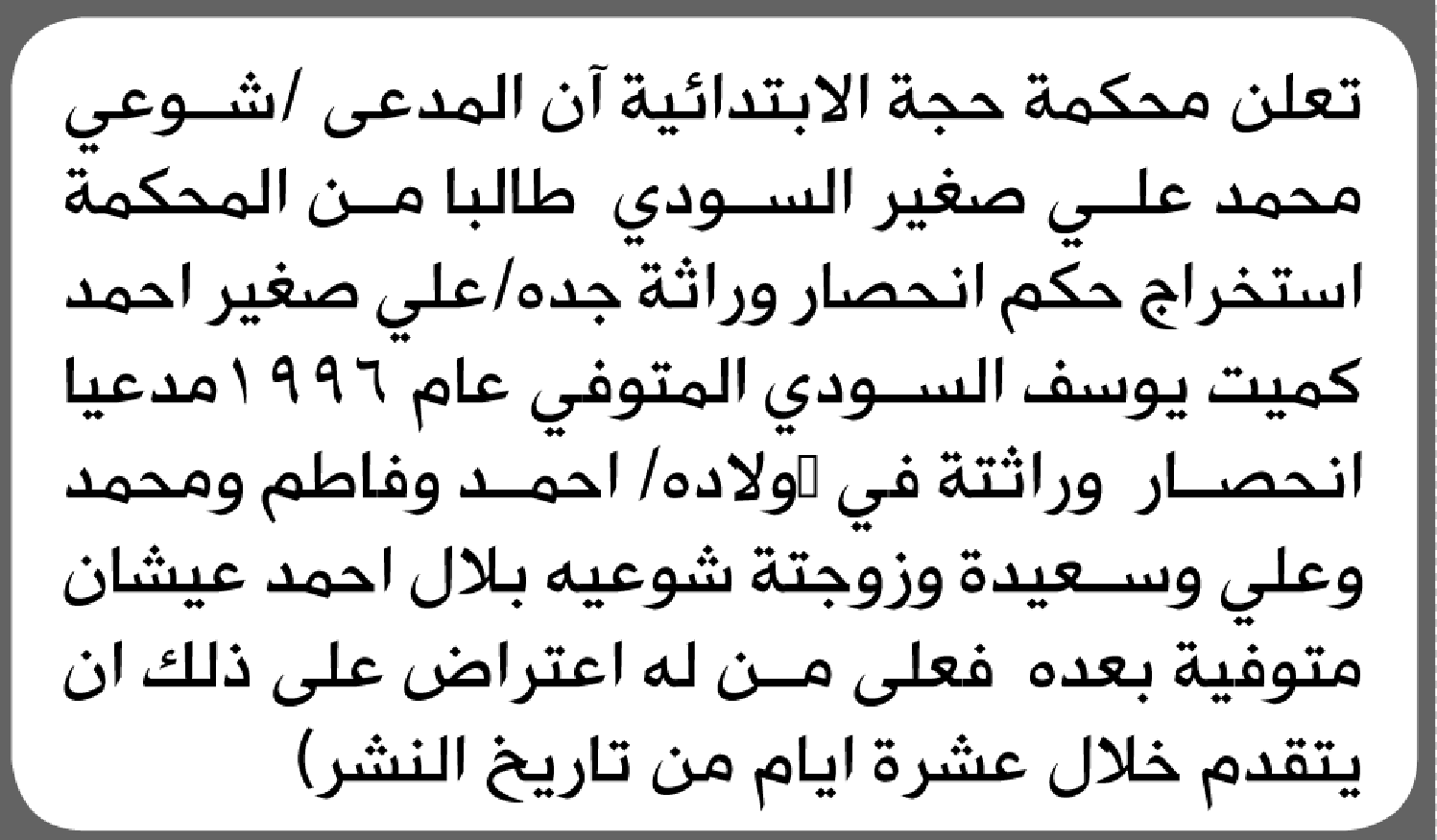 تعلن محكمة حجة أن المدعي شوعي السودي تقدم بدعوى انحصار وراثة إعلاناتمحاكم On أبريل 16, 2026 Share Share FacebookTwitterWhatsAppTelegramGoogle+البريد الإلكترونيPrint