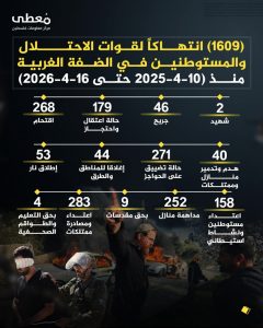 كشف مركز معلومات فلسطين (مُعطى) ، اليوم الجمعة ، عن ارتكاب قوات العدو الإسرائيلي والمستوطنين الصهاينة 1609 انتهاكات بحق الفلسطينيين في الضفة الغربية المحتلة خلال الأسبوع الماضي.