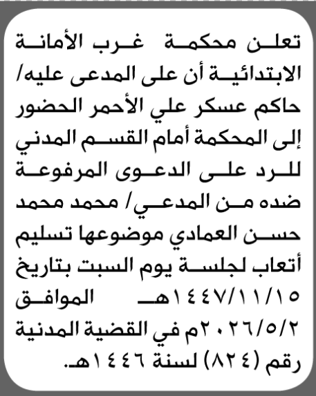 تعلن محكمة غرب الأمانة بأن على/ حاكم عسكر الأحمر الحضور إلى المحكمة إعلاناتمحاكم On أبريل 19, 2026 Share Share FacebookTwitterWhatsAppTelegramGoogle+البريد الإلكترونيPrint