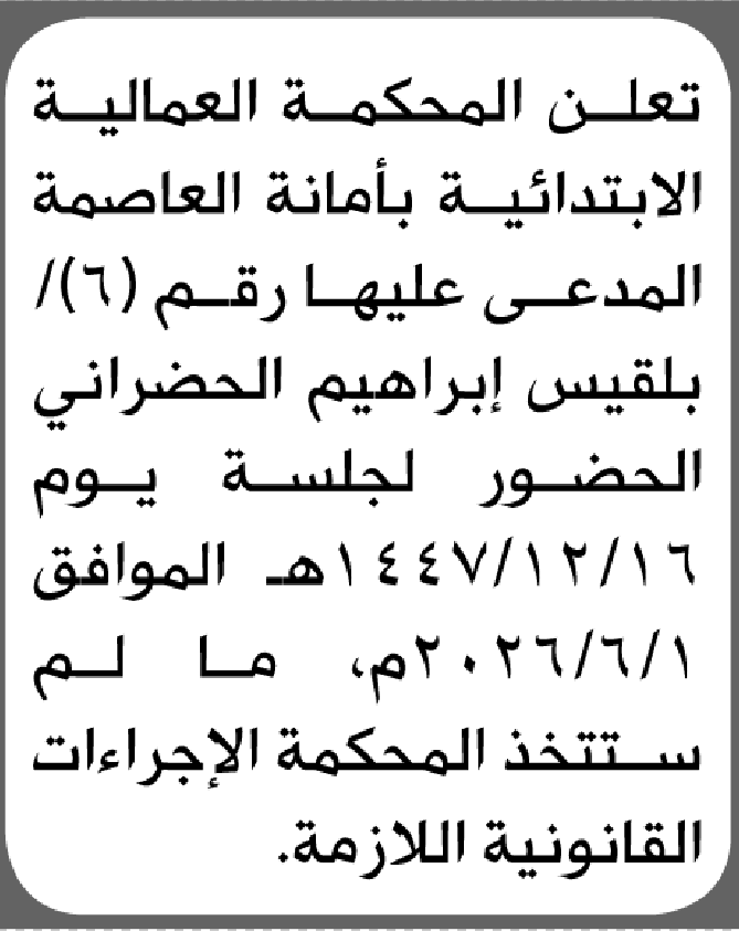 تعلن المحكمة العمالية بالأمانة أن على المدعى عليها بلقيس الحضراني الحضور إلى المحكمة إعلاناتمحاكم On أبريل 20, 2026 Share Share FacebookTwitterWhatsAppTelegramGoogle+البريد الإلكترونيPrint