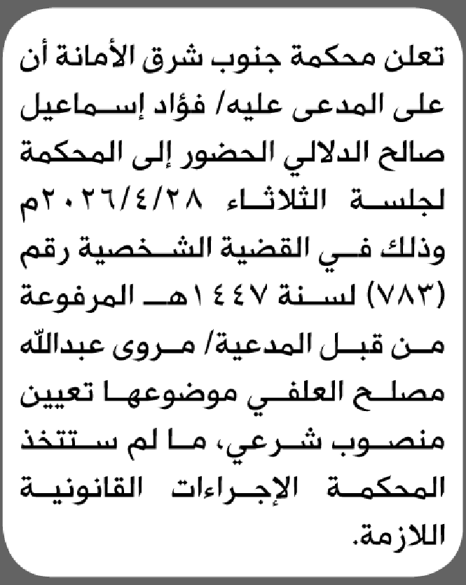 تعلن محكمة جنوب شرق الأمانة أن على المدعى عليه فؤاد الدلالي الحضور إلى المحكمة إعلاناتمحاكم On أبريل 20, 2026 Share Share FacebookTwitterWhatsAppTelegramGoogle+البريد الإلكترونيPrint