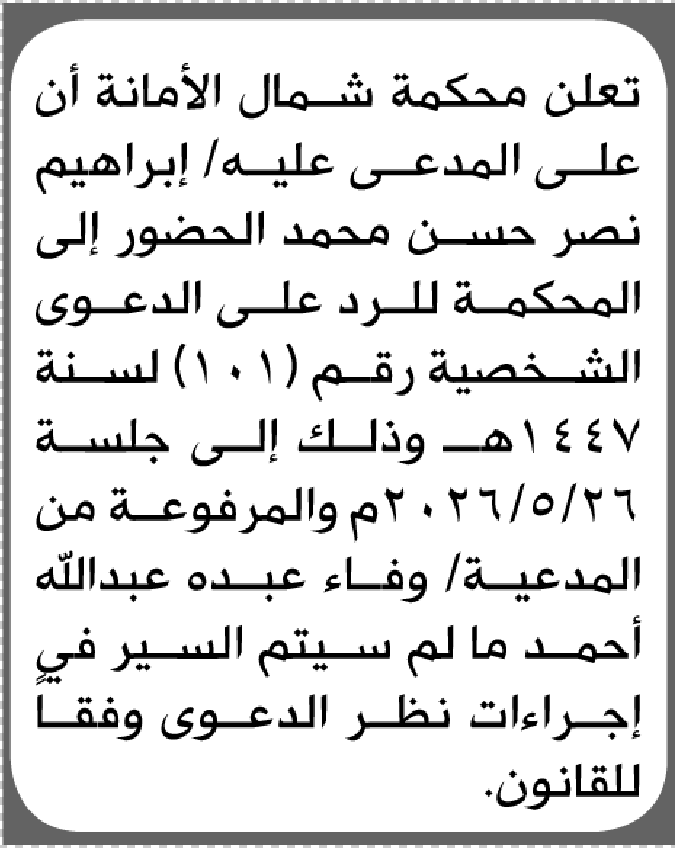 تعلن محكمة شمال الأمانة بأن على/ إبراهيم نصر محمد الحضور إلى المحكمة إعلاناتمحاكم On أبريل 20, 2026 Share Share FacebookTwitterWhatsAppTelegramGoogle+البريد الإلكترونيPrint
