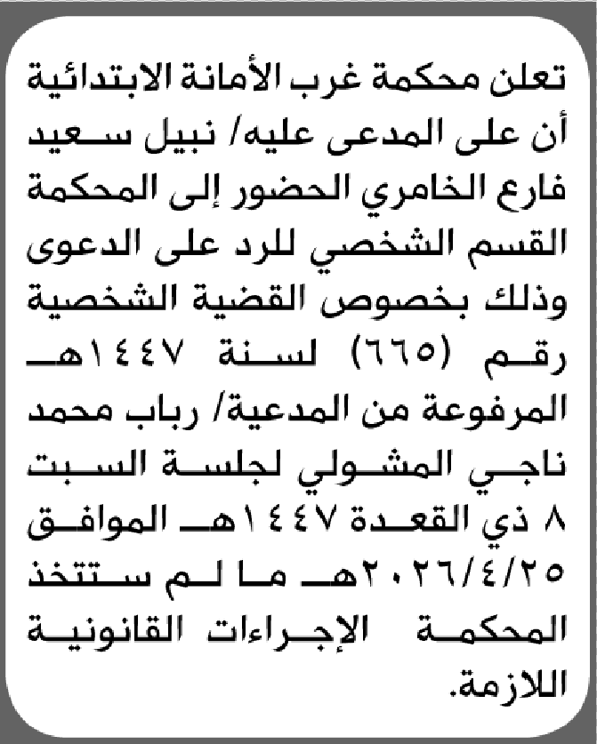 تعلن محكمة غرب الأمانة بأن على/ نبيل سعيد الخامري الحضور إلى المحكمة إعلاناتمحاكم On أبريل 20, 2026 Share Share FacebookTwitterWhatsAppTelegramGoogle+البريد الإلكترونيPrint
