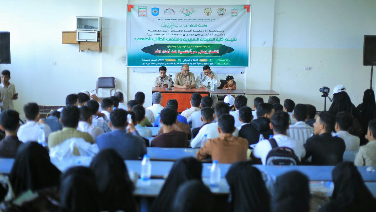 نظمت كلية الصيدلة وملتقى الطالب الجامعي بجامعة الحديدة اليوم الاحد، ندوة ثقافية فكرية بعنوان”شعار الصرخة يمثل حربا نفسية ضد أعداء الله”.