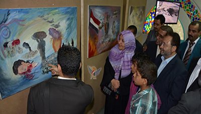 وذكرت بأن المعرض يوجد فيه قسمين الاول خاص برسومات الفن التشكيلي ورسوم الاطفال والذي يعبر عن صمود الشعب اليمني وتغلبه على هذا العدوان الهمجي الغاشم بالإرادة والصبر والثاني وصور فوتوغرافية تحكي حجم الدمار الذي خلفه القصف الجوي لطائرات العدوان السعودي واستهدافه للأرض والإنسان.