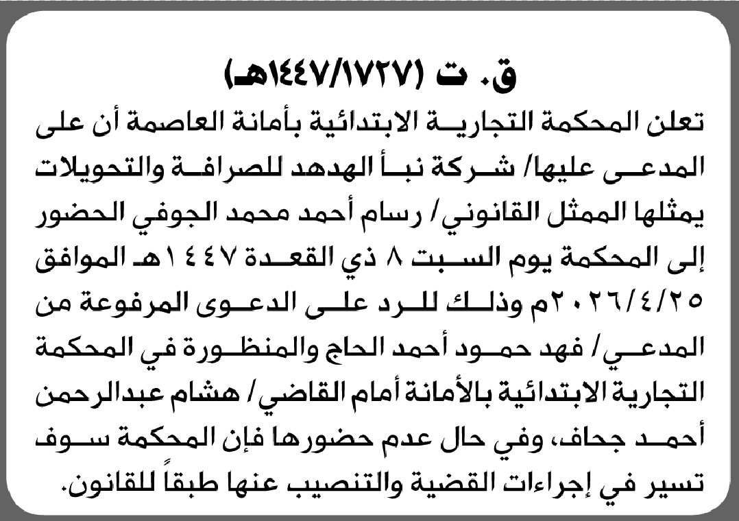 تعلن المحكمة التجارية بالأمانة أن على المدعى عليها شركة نبأ الهدهد للصرافة الحضور إلى المحكمة إعلاناتمحاكم On أبريل 21, 2026 Share Share FacebookTwitterWhatsAppTelegramGoogle+البريد الإلكترونيPrint