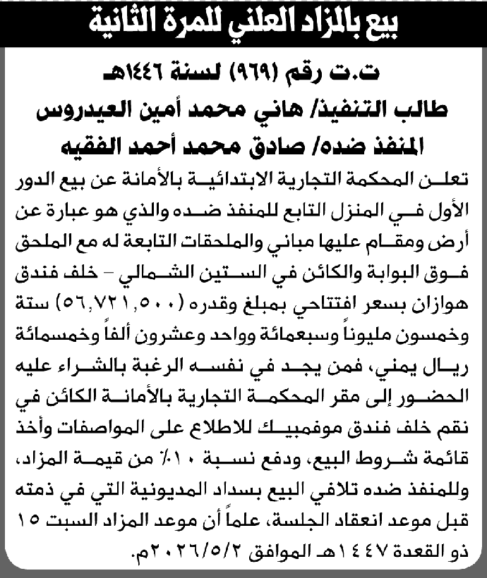 تعلن المحكمة التجارية بالأمانة عن بيع العقار التابع للمنفذ ضده صادق الفقيه إعلاناتمحاكم On أبريل 21, 2026 Share Share FacebookTwitterWhatsAppTelegramGoogle+البريد الإلكترونيPrint