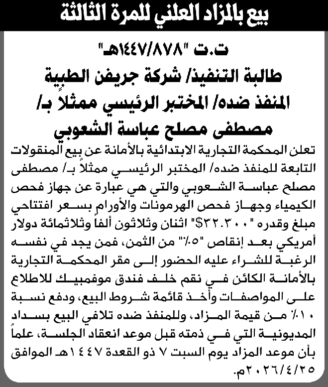تعلن المحكمة التجارية بالأمانة عن بيع المنقولات التابعة للمنفذ ضده مصطفى الشعوبي إعلاناتمحاكم On أبريل 21, 2026 Share Share FacebookTwitterWhatsAppTelegramGoogle+البريد الإلكترونيPrint