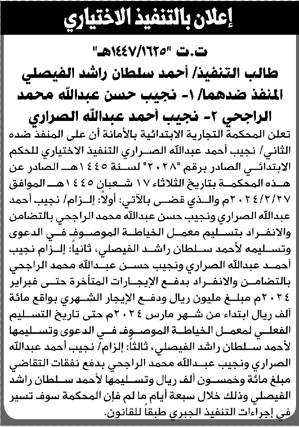 تعلن المحكمة التجارية بالأمانة للمنفذ ضدهما نجيب الراجحي وآخر بالتنفيذ الاختياري للحكم إعلاناتمحاكم On أبريل 21, 2026 Share Share FacebookTwitterWhatsAppTelegramGoogle+البريد الإلكترونيPrint