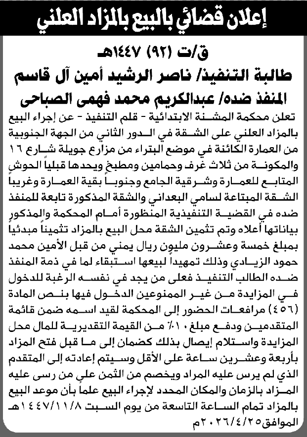 تعلن محكمة المشنة عن بيع العقار التابع للمنفذ ضده عبدالكريم الصباحي إعلاناتمحاكم On أبريل 21, 2026 Share Share FacebookTwitterWhatsAppTelegramGoogle+البريد الإلكترونيPrint