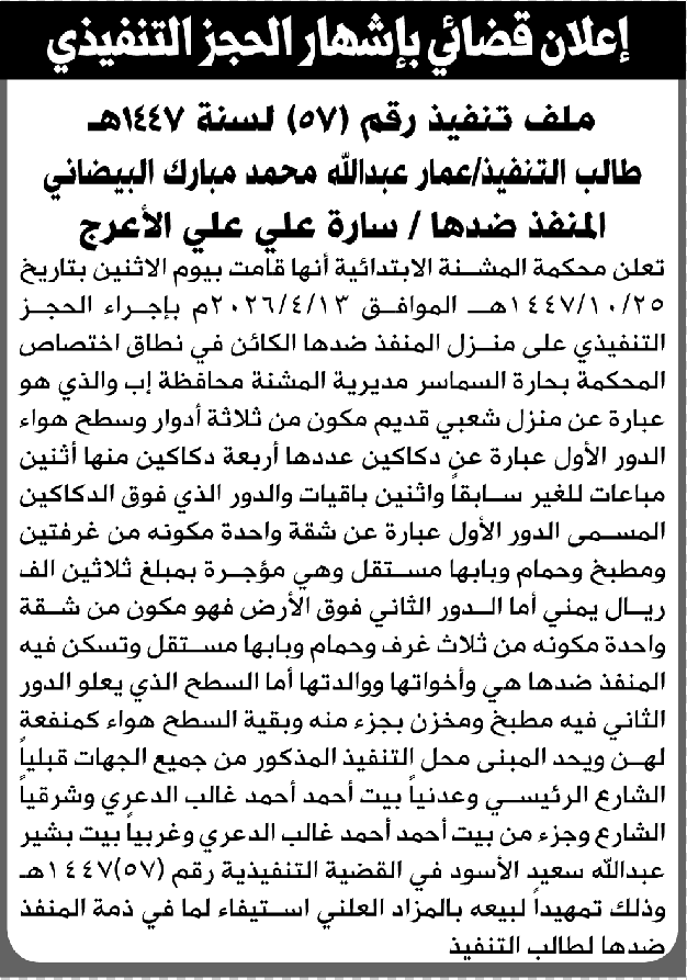 تعلن محكمة المشنة عن حجز العقار التابع للمنفذ ضدها سارة الأعرج إعلاناتمحاكم On أبريل 21, 2026 Share Share FacebookTwitterWhatsAppTelegramGoogle+البريد الإلكترونيPrint