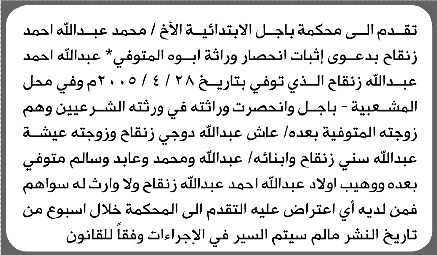 تعلن محكمة باجل الابتدائية بأن الأخ/ محمد عبدالله زنقاح تقدم إليها بطلب انحصار وراثة إعلاناتمحاكم On أبريل 23, 2026 Share Share FacebookTwitterWhatsAppTelegramGoogle+البريد الإلكترونيPrint