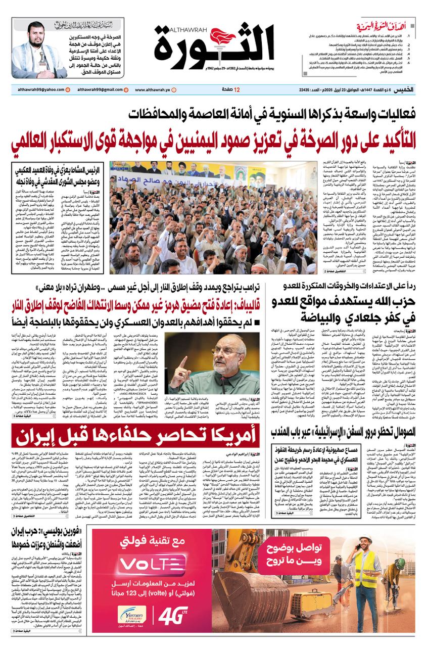الصحيفة الورقية صحيفة الثورة الخميس 6 ذوالقعدة 1447-23 ابريل 2026 On أبريل 22, 2026 Share View Fullscreen Share FacebookTwitterWhatsAppTelegramGoogle+البريد الإلكترونيPrint