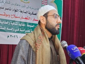 ولفت إلى أن الشعب اليمني أصبح اليوم،من أكثر الشعوب وعياً وبصيرة بفضل المسيرة والمشروع القرآني وشعار الصرخة،حاثاً على التحرك المستمر في تحصين أفراد الشعب اليمني بهدي الله وقرآنه.،مشيراً إلى أن الأمة تستطيع الخروج من حالة الذل والهوان من خلال هذا الشعار والمشروع القرآني الذي أطلقه الشهيد القائد.