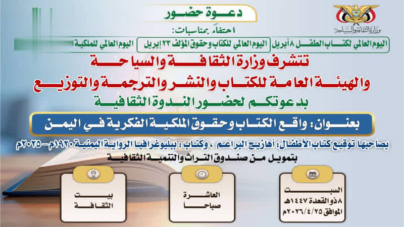 وأوضح وكيل وزارة الثقافة والسياحة لقطاع المصنفات والملكية الفكرية عبدالملك القطاع لوكالة الأنباء اليمنية (سبأ)، أن الندوة التي ستقام في إطار الاحتفاء باليوم العالمي لكتاب الطفل 8 ابريل، واليوم العالمي للكتاب وحقوق المؤلف 23 أبريل، واليوم العالمي للملكية الفكرية 26 أبريل، ستتناول ثلاث أوراق عمل، تشمل حقوق المؤلف والحقوق المجاورة في القانون اليمني وتعظيم القيمة الاقتصادية للأصول الفكرية في ظل الاقتصاد الإبداعي، والكتاب ودوره في تطور حضارة الأمم.