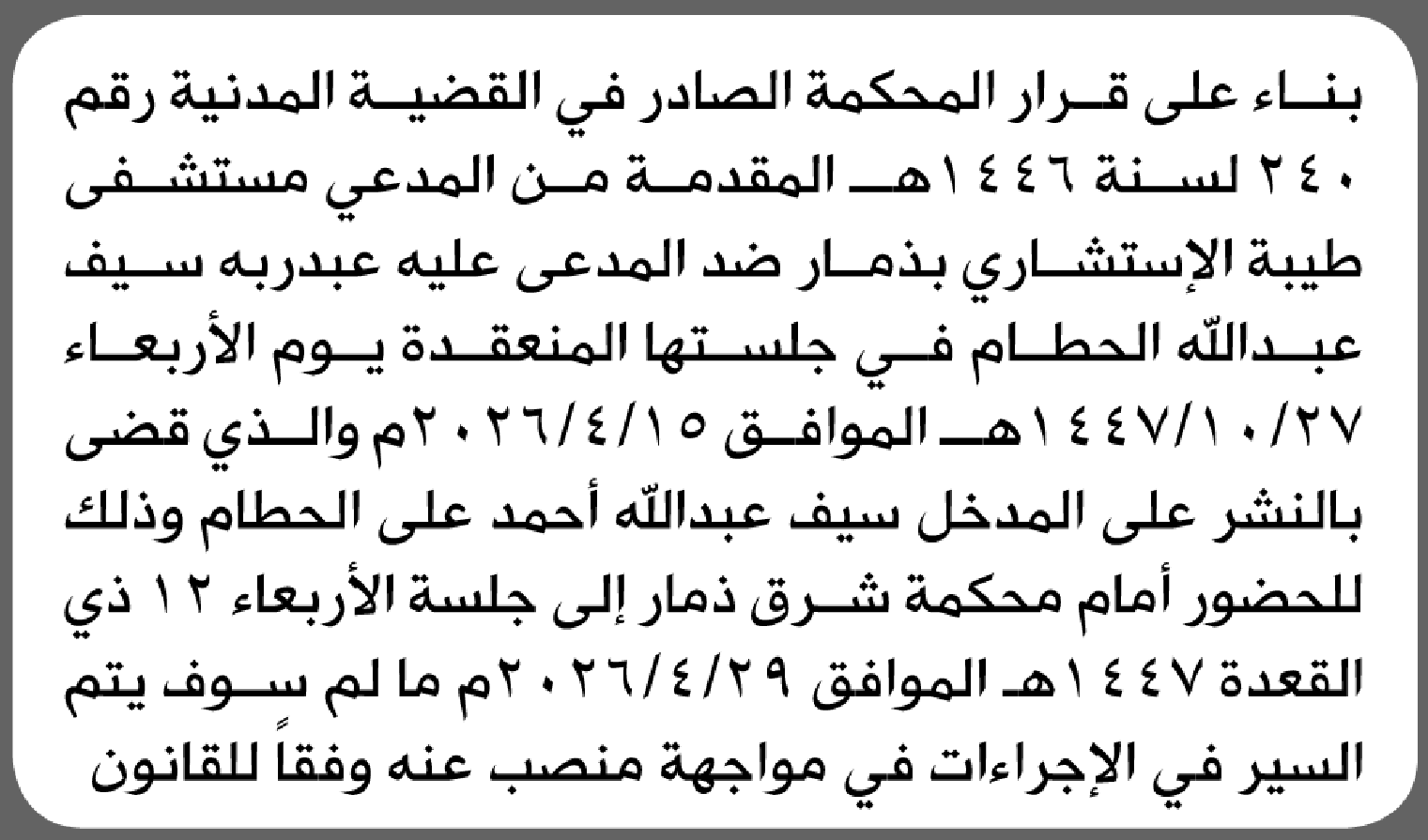 تعلن محكمة شرق ذمار بأن على/عبدربه سيف الحطام الحضور إلى المحكمة إعلاناتمحاكم On أبريل 24, 2026 Share Share FacebookTwitterWhatsAppTelegramGoogle+البريد الإلكترونيPrint