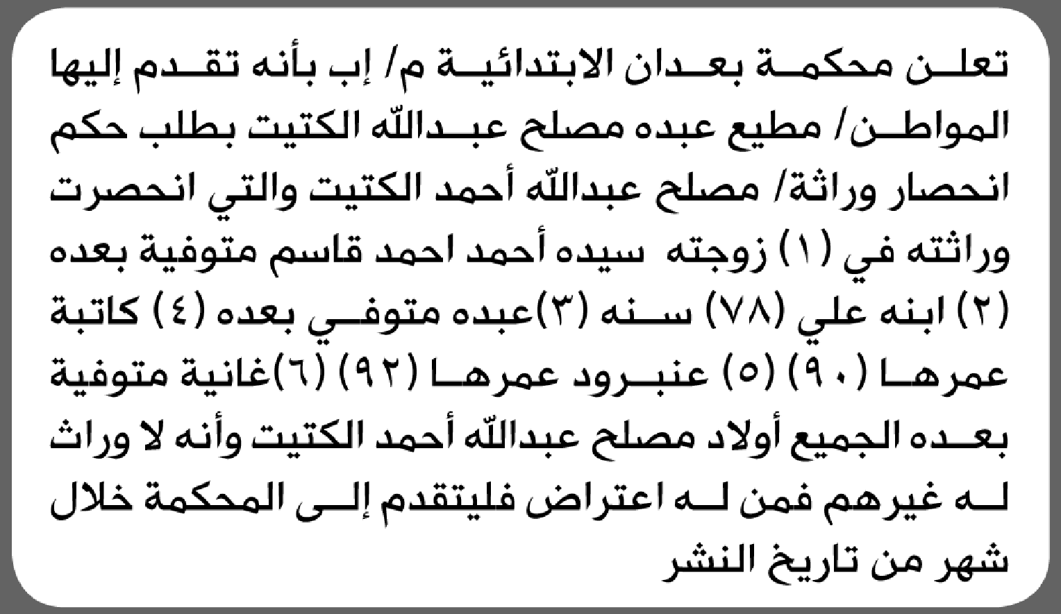 تعلن محكمة بعدان أن الأخ مطيع الكتيت تقدم بدعوى انحصار وراثة إعلاناتمحاكم On أبريل 24, 2026 Share Share FacebookTwitterWhatsAppTelegramGoogle+البريد الإلكترونيPrint