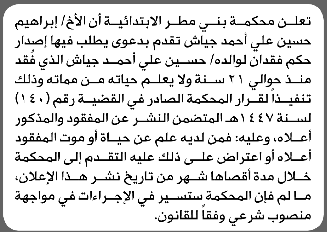 تعلن محكمة بني مطر أن الأخ إبراهيم جياش تقدم بدعوى انحصار وراثة إعلاناتمحاكم On أبريل 24, 2026 Share Share FacebookTwitterWhatsAppTelegramGoogle+البريد الإلكترونيPrint