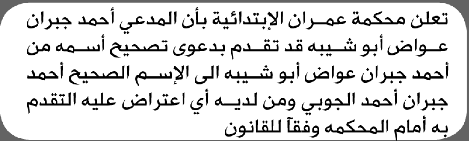 تعلن محكمة عمران أن المدعي أحمد أبو شيبه تقدم بطلب تصحيح اسمه إعلاناتمحاكم On أبريل 24, 2026 Share Share FacebookTwitterWhatsAppTelegramGoogle+البريد الإلكترونيPrint