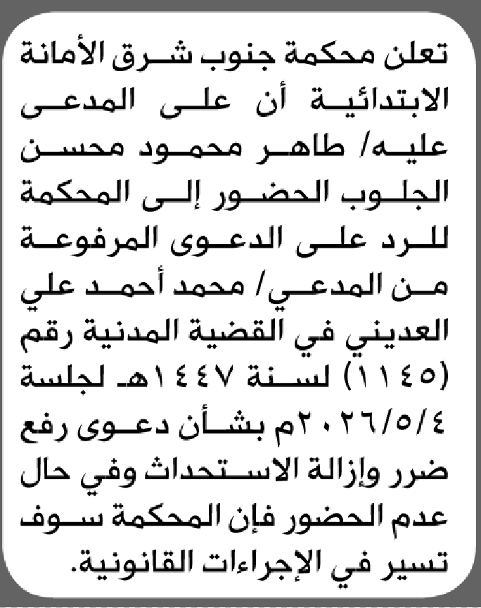 تعلن محكمة جنوب شرق الأمانة بأن على/ طاهر محمود الجلوب الحضور إلى المحكمة إعلاناتمحاكم On أبريل 26, 2026 Share Share FacebookTwitterWhatsAppTelegramGoogle+البريد الإلكترونيPrint
