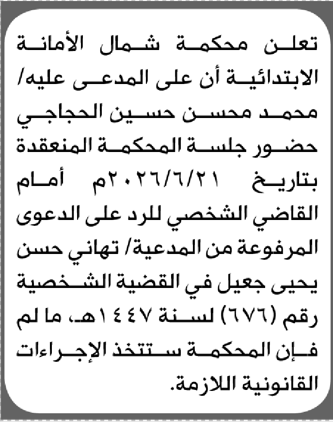تعلن محكمة شمال الأمانة بأن على/ محمد محسن الحجاجي الحضور إلى المحكمة إعلاناتمحاكم On أبريل 26, 2026 Share Share FacebookTwitterWhatsAppTelegramGoogle+البريد الإلكترونيPrint