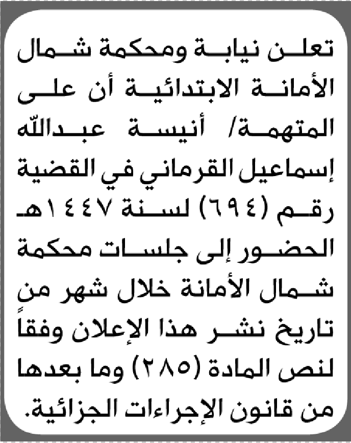 تعلن محكمة شمال الامانة بأن على/ أنيسة عبدالله القرماني الحضور إلى المحكمة إعلاناتمحاكم On أبريل 26, 2026 Share Share FacebookTwitterWhatsAppTelegramGoogle+البريد الإلكترونيPrint