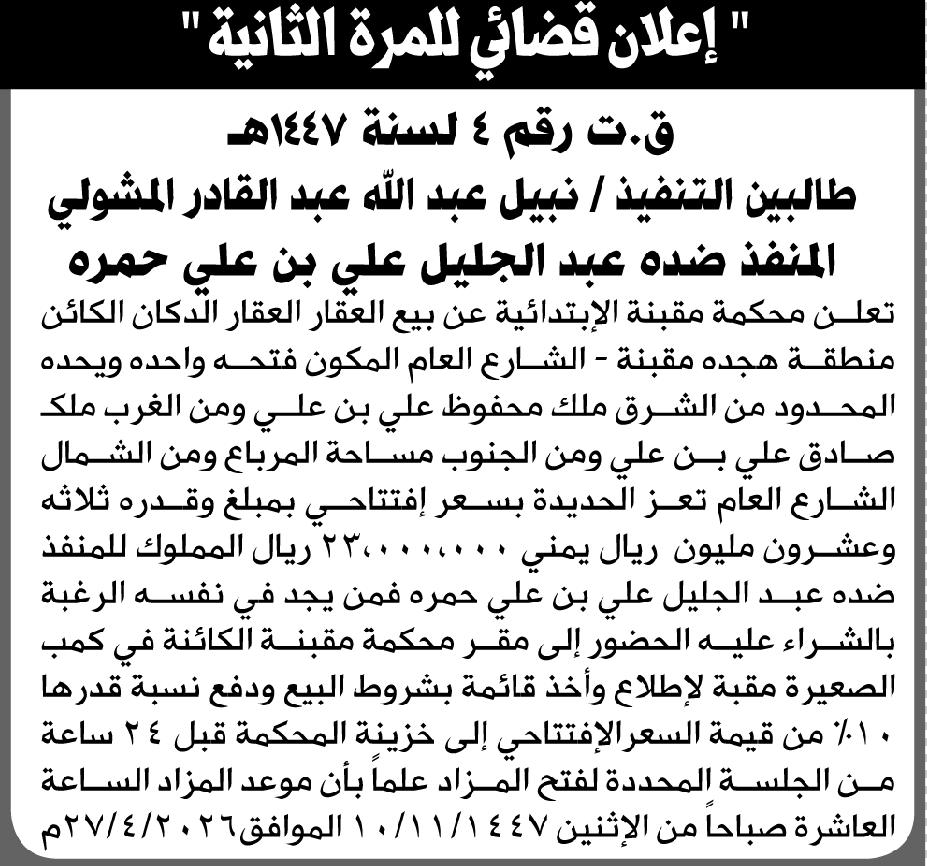تعلن محكمة مقبنة الابتدائية عن بيع بالمزاد العلني لعقار المنفذ ضده/ عبدالجليل علي حمره إعلاناتمحاكم On أبريل 26, 2026 Share Share FacebookTwitterWhatsAppTelegramGoogle+البريد الإلكترونيPrint