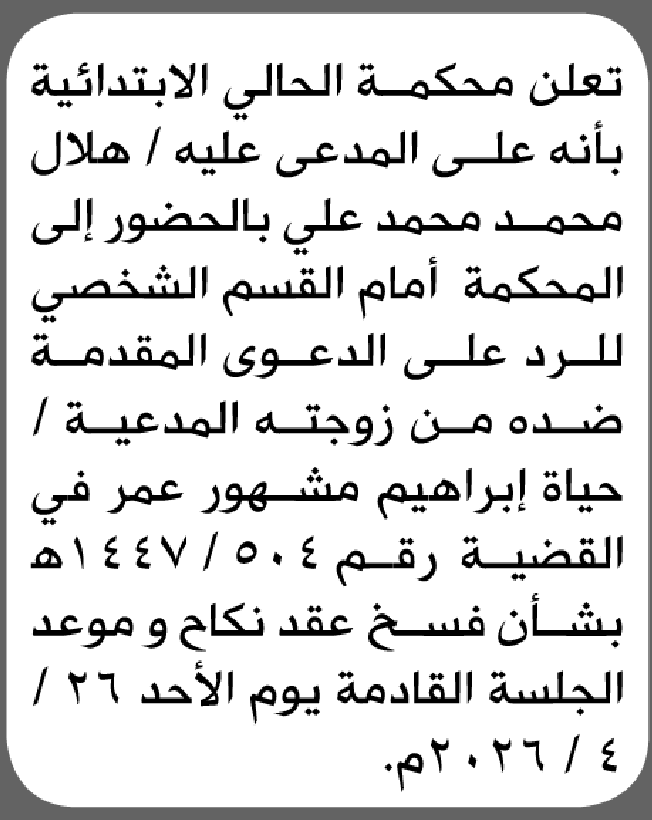 تعلن محكمة الحالي الابتدائية بأن على/ هلال محمد علي الحضور إلى المحكمة إعلاناتمحاكم On أبريل 26, 2026 Share Share FacebookTwitterWhatsAppTelegramGoogle+البريد الإلكترونيPrint