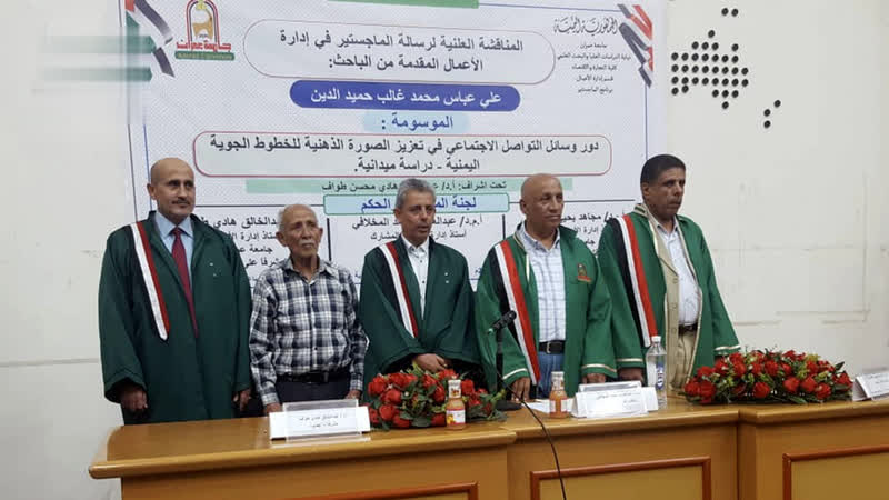 حصل الباحث علي عباس حميد الدين على درجة الماجستير بامتياز في إدارة الأعمال من كلية التجارة والاقتصاد بجامعة عمران عن رسالته الموسومة بـ “دور وسائل التواصل الاجتماعي في تعزيز الصورة الذهنية للخطوط الجوية اليمنية – دراسة ميدانية”.