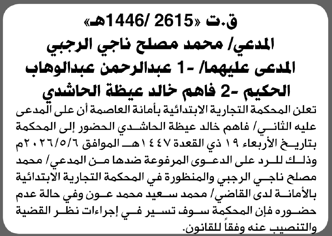 تعلن المحكمة التجارية الابتدائية بأن على/ عبدالرحمن الحكيم وفاهم الحاشدي الحضور إلى المحكمة إعلاناتمحاكم On أبريل 27, 2026 Share Share FacebookTwitterWhatsAppTelegramGoogle+البريد الإلكترونيPrint