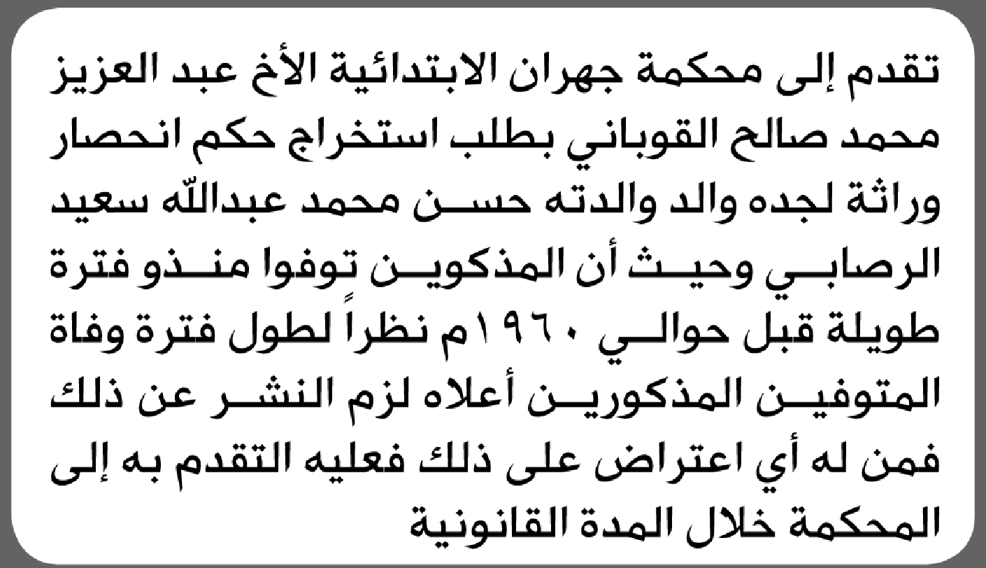 تعلن محكمة جهران الابتدائية بأن الأخ/ عبدالعزيز محمد القوباني تقدم إليها بطلب انحصار وراثة إعلاناتمحاكم On أبريل 27, 2026 Share Share FacebookTwitterWhatsAppTelegramGoogle+البريد الإلكترونيPrint