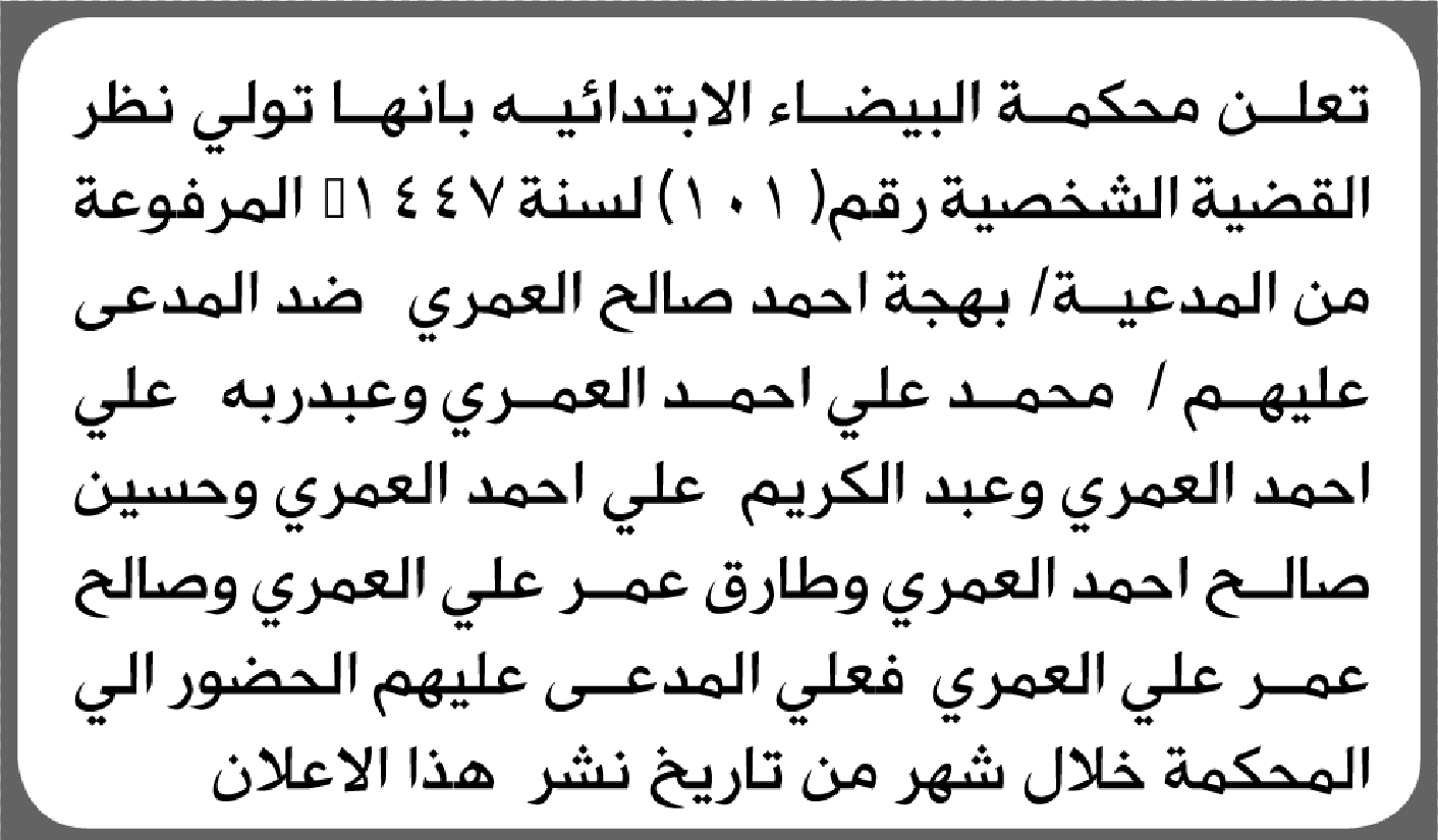 تعلن محكمة البيضاء الابتدائية بأن على/ محمد علي العمري وأخرين الحضور إلى المحكمة إعلاناتمحاكم On أبريل 27, 2026 Share Share FacebookTwitterWhatsAppTelegramGoogle+البريد الإلكترونيPrint