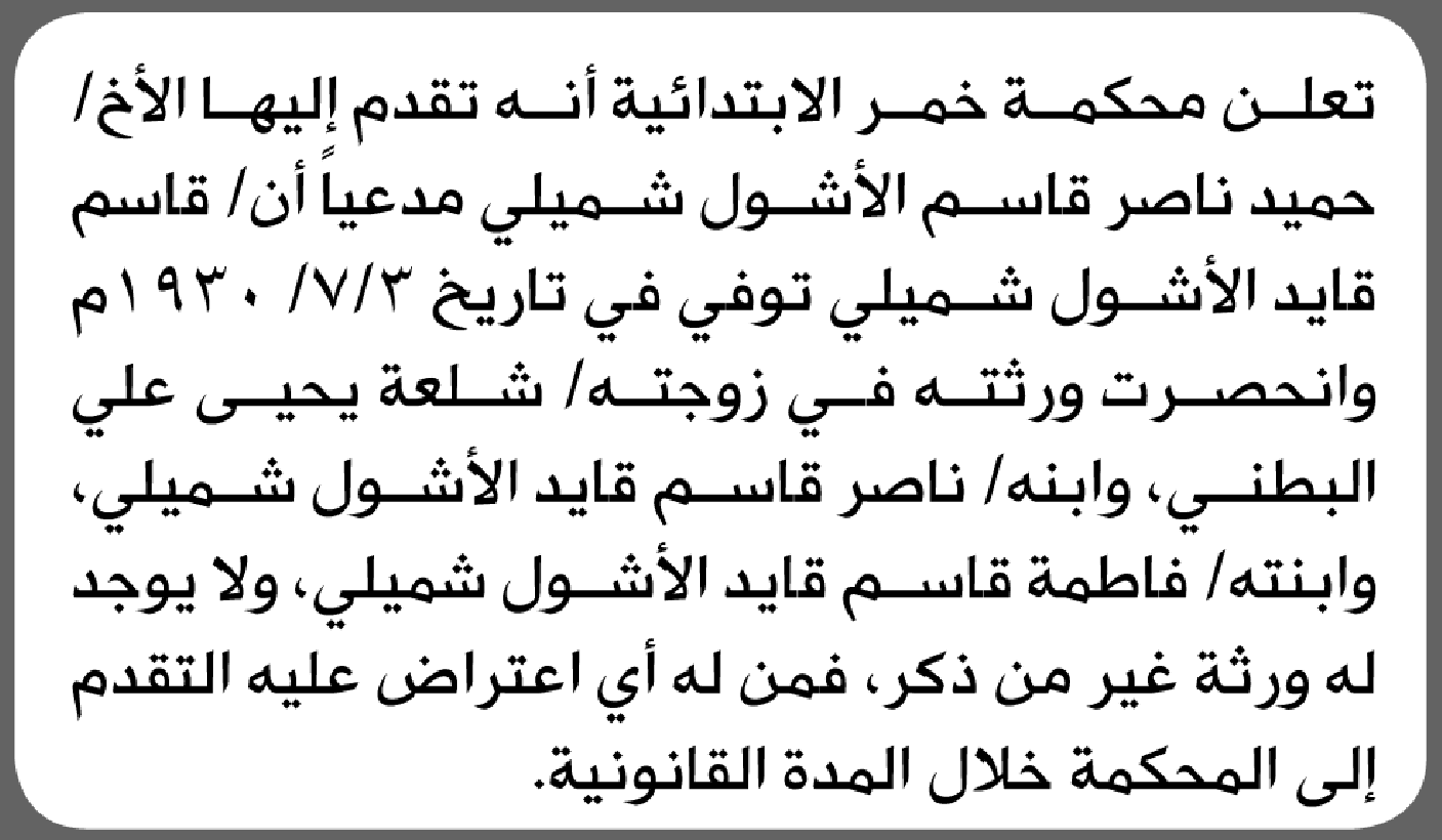 تعلن محكمة خمر الابتدائية بأن الأخ/ حميد ناصر شميلي تقدم إليها بطلب انحصار وراثة إعلاناتمحاكم On أبريل 27, 2026 Share Share FacebookTwitterWhatsAppTelegramGoogle+البريد الإلكترونيPrint