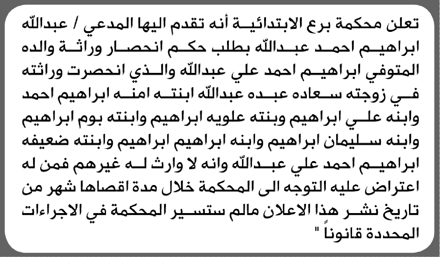 تعلن محكمة برع الابتدائية بأن الأخ/ عبدالله إبراهيم عبدالله تقدم إليها بطلب انحصار وراثة إعلاناتمحاكم On أبريل 27, 2026 Share Share FacebookTwitterWhatsAppTelegramGoogle+البريد الإلكترونيPrint