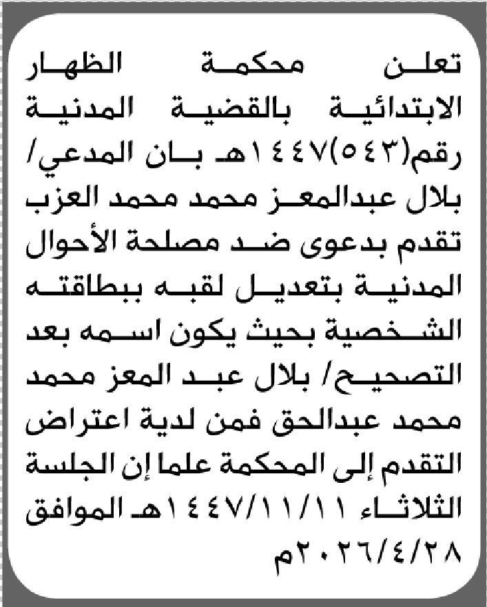 تعلن محكمة الظهار أن المدعي بلال العزب تقدم بطلب تصحيح اسمه إعلاناتمحاكم On أبريل 27, 2026 Share Share FacebookTwitterWhatsAppTelegramGoogle+البريد الإلكترونيPrint