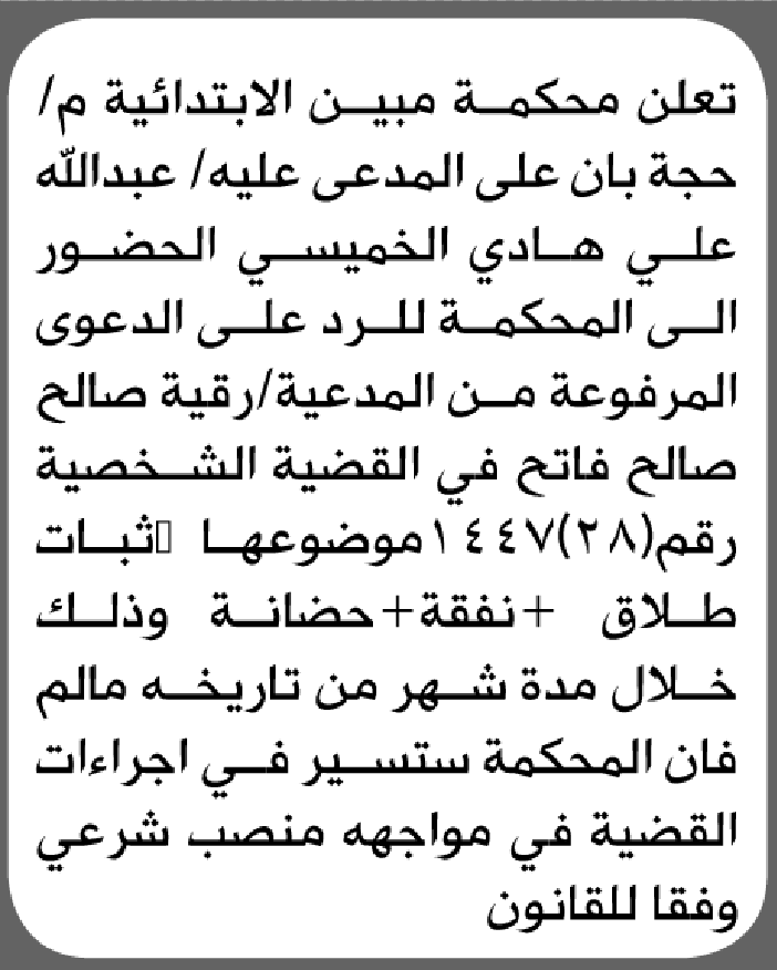 تعلن محكمة مبين أن على المدعى عليه عبدالله الخميسي الحضور إلى المحكمة إعلاناتمحاكم On أبريل 27, 2026 Share Share FacebookTwitterWhatsAppTelegramGoogle+البريد الإلكترونيPrint