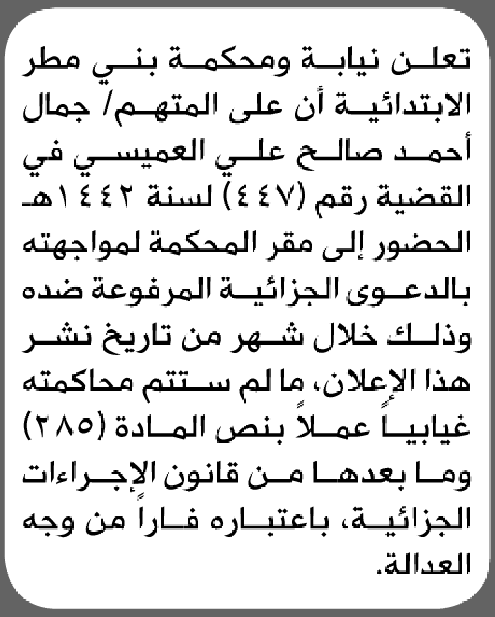 تعلن نيابة ومحكمة بني مطر أن على المهتم جمال العميسي الحضور إلى المحكمة إعلاناتمحاكم On أبريل 27, 2026 Share Share FacebookTwitterWhatsAppTelegramGoogle+البريد الإلكترونيPrint