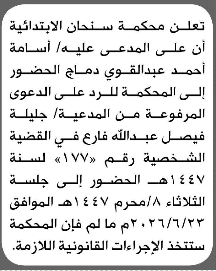 تعلن محكمة سنحان أن على المدعى عليه أسامة دماج الحضور إلى المحكمة إعلاناتمحاكم On أبريل 28, 2026 Share Share FacebookTwitterWhatsAppTelegramGoogle+البريد الإلكترونيPrint