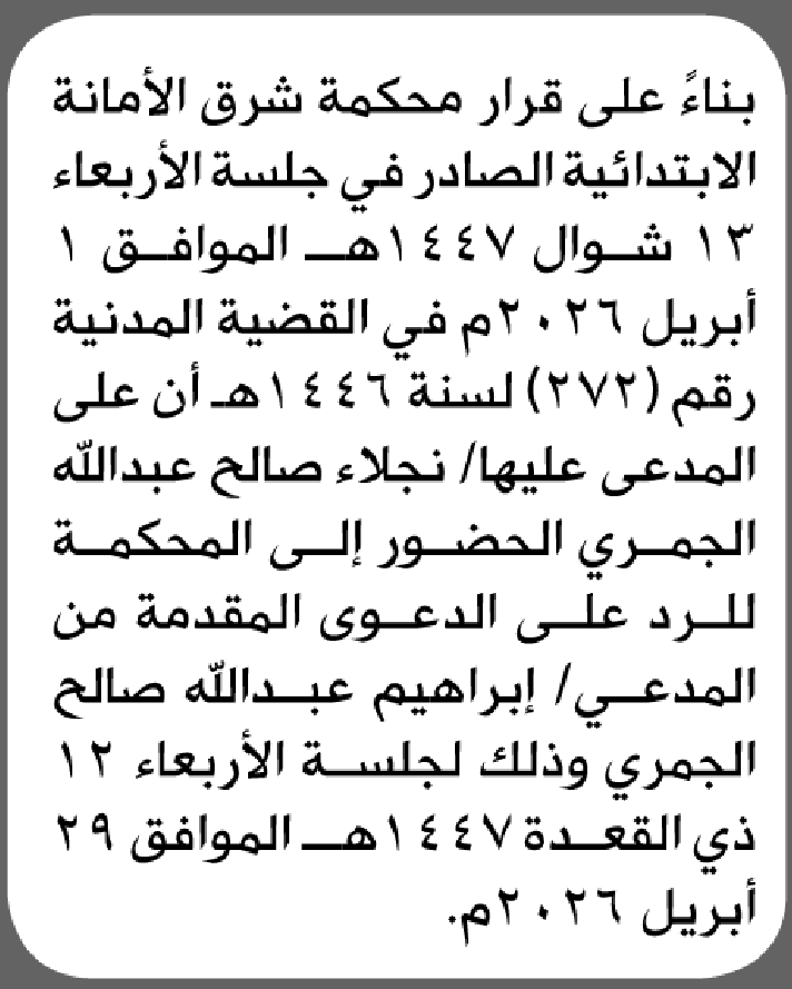 تعلن محكمة شرق الأمانة أن على المدعى عليها نجلاء الجمري الحضور إلى المحكمة إعلاناتمحاكم On أبريل 28, 2026 Share Share FacebookTwitterWhatsAppTelegramGoogle+البريد الإلكترونيPrint