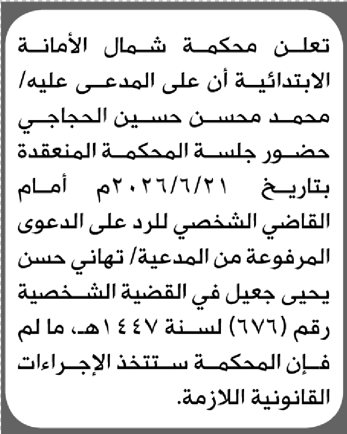 تعلن محكمة شمال الأمانة أن على المدعى عليه محمد الحجاجي الحضور إلى المحكمة إعلاناتمحاكم On أبريل 28, 2026 Share Share FacebookTwitterWhatsAppTelegramGoogle+البريد الإلكترونيPrint
