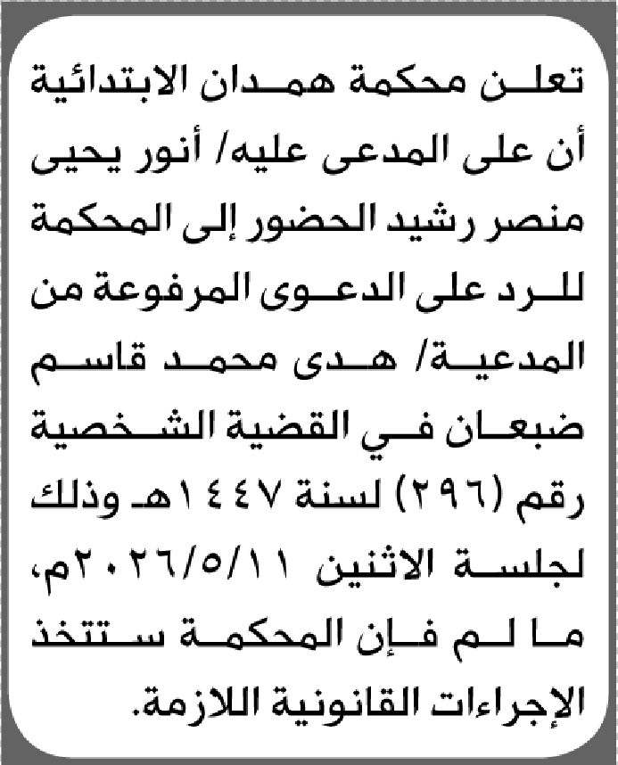 تعلن محكمة همدان أن على المدعى عليه أنور رشيد الحضور إلى المحكمة إعلاناتمحاكم On أبريل 28, 2026 Share Share FacebookTwitterWhatsAppTelegramGoogle+البريد الإلكترونيPrint