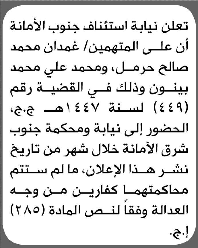 تعلن نيابة استئناف جنوب الأمانة بأن على/ غمدان حرمل ومحمد بينون الحضور إلى المحكمة إعلاناتمحاكم On أبريل 28, 2026 Share Share FacebookTwitterWhatsAppTelegramGoogle+البريد الإلكترونيPrint