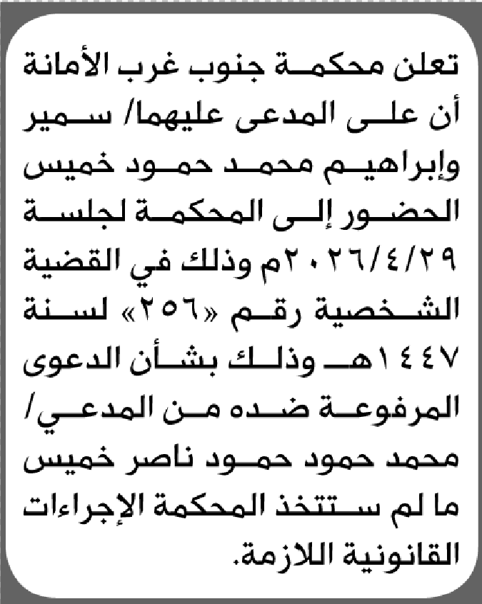 تعلن محكمة جنوب غرب الامانة بأن على/ سمير وإبراهيم محمد خميس الحضور إلى المحكمة إعلاناتمحاكم On أبريل 29, 2026 Share Share FacebookTwitterWhatsAppTelegramGoogle+البريد الإلكترونيPrint