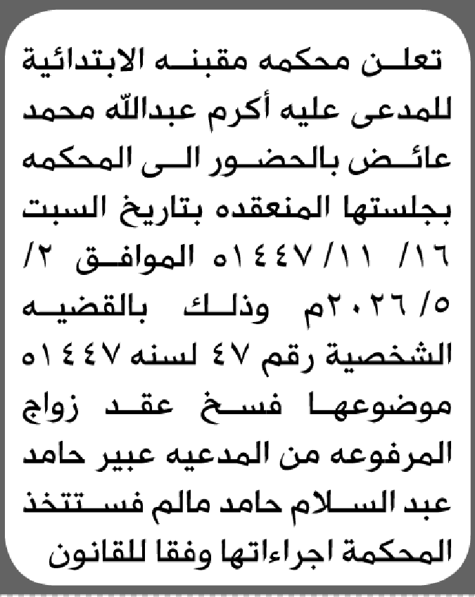 تعلن محكمة مقبنه الابتدائية بأن على/ أكرم عبدالله عائض الحضور إلى المحكمة إعلاناتمحاكم On أبريل 29, 2026 Share Share FacebookTwitterWhatsAppTelegramGoogle+البريد الإلكترونيPrint