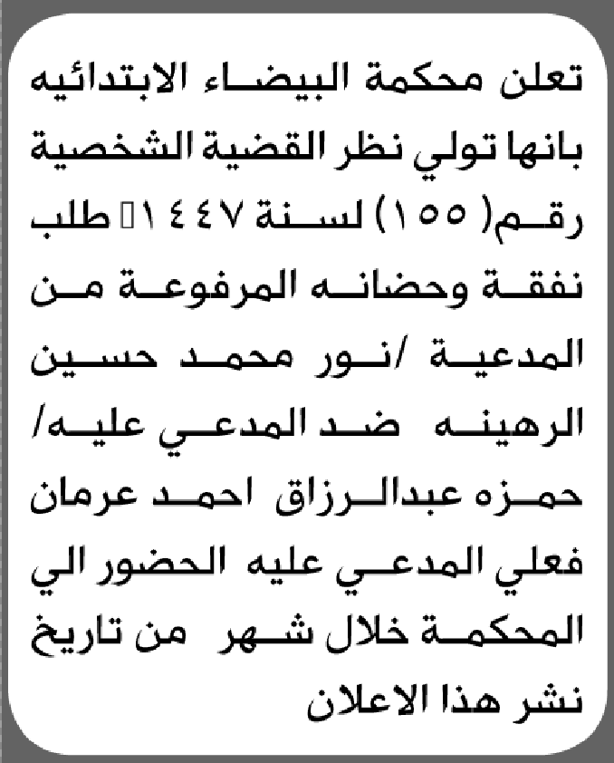 تعلن محكمة البيضاء الابتدائية بأن على/ حمزة عبدالرازق عرمان الحضور إلى المحكمة إعلاناتمحاكم On أبريل 29, 2026 Share Share FacebookTwitterWhatsAppTelegramGoogle+البريد الإلكترونيPrint