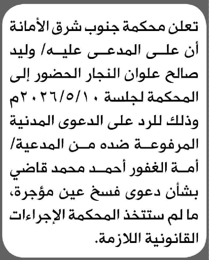 تعلن محكمة جنوب شرق الأمانة بأن على/ وليد صالح النجار الحضور إلى المحكمة إعلاناتمحاكم On أبريل 29, 2026 Share Share FacebookTwitterWhatsAppTelegramGoogle+البريد الإلكترونيPrint