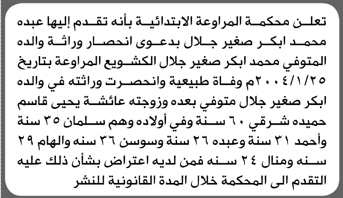 تعلن محكمة المراوعة أن الأخ عبده محمد أبكر تقدم بدعوى انحصار وراثة إعلاناتمحاكم On أبريل 29, 2026 Share Share FacebookTwitterWhatsAppTelegramGoogle+البريد الإلكترونيPrint