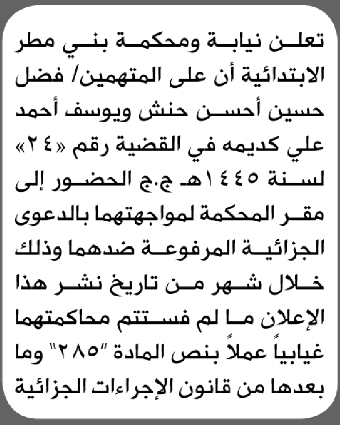 تعلن نيابة ومحكمة بني مطر أن على المتهمين فضل حنش وآخر الحضور إلى المحكمة إعلاناتمحاكم On أبريل 29, 2026 Share Share FacebookTwitterWhatsAppTelegramGoogle+البريد الإلكترونيPrint