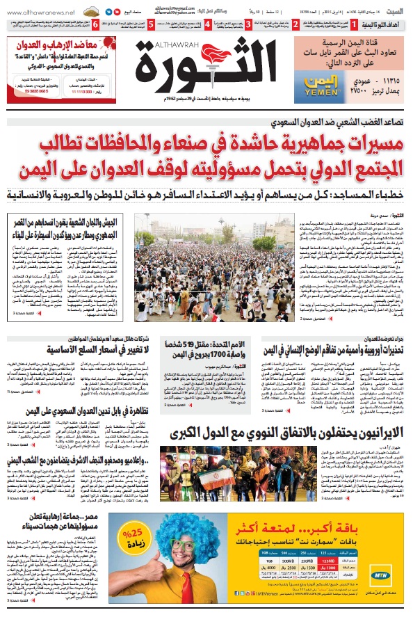 الصحيفة الورقية 04 أبريل 2015 On أبريل 4, 2015 Share صحيفة الثورة النسخة الإلكترونية للصحيفة ليوم 04 السبت أبريل 2015 الصفحة 01الصفحة 02الصفحة 03الصفحة 04الصفحة 05الصفحة 06الصفحة 07الصفحة 08الصفحة 09الصفحة 11الصفحة 12الصفحة 13الصفحة 14الصفحة 15الصفحة 16 Share FacebookTwitterWhatsAppTelegramGoogle+البريد الإلكترونيPrint